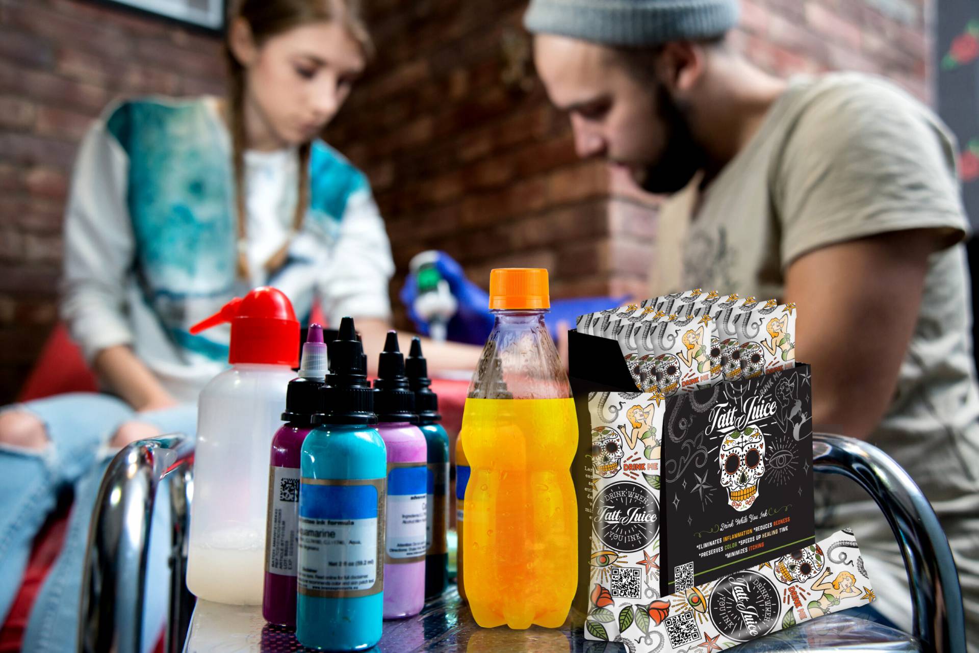 A delicious all-natural INTERNAL tattoo aftercare BEVERAGE with essential vitamins and minerals. Tatt Juice is an all-new approach to tattoo care focusing on the tattooed body by providing a focused internal tattoo care formula that promotes and speeds up the healing of the body and skin. Tatt Juice is a specially formulated tattoo recovery beverage taken internally to promote healthy skin using vitamins, minerals, and more to assist the body with exactly what it needs during the recovery and healing period from getting a new tattoo. Use with your favorite topical tattoo aftercare product!